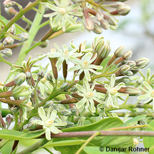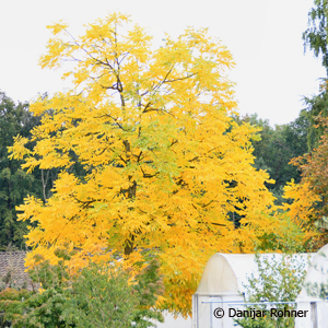 Der Geweihbaum präsentiert sich als ein eigenwilliger laubabwerfender Baum. Die riesigen, gefiederten Bläter und die dicken, knorrigen, bizarr wirkenden Äste verleihen ihm ein markantes Aussehen. Im Herbst strahlt dieser Baum mit einer gelben Herbstfärbung. 10 – 15 Meter hoch.