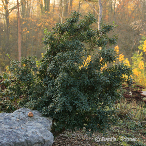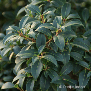 Langsam und kompakt wachsend. Höhe ca. 2,5 m. Schnittverträglich. Blatt lederartig glänzend dunkelgrün. Duftende weiße Blüten. Blaue Beeren. Sonne-Schatten. Fruchtbare Böden.