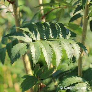 Locker aufgebauter Baum. Zuerst schmal, später breiter ausladend. Höhe bis ca. 10 m. Blatt gefiedert und dunkelgrün. Herbstfärbung gelborange. Weisse Blüten in Sträussen, Mai-Juni. Orangerote Beeren im Spätsommer. Gedeiht auf mageren und trockenen Böden.