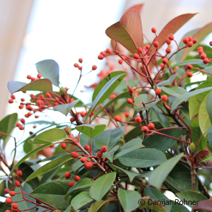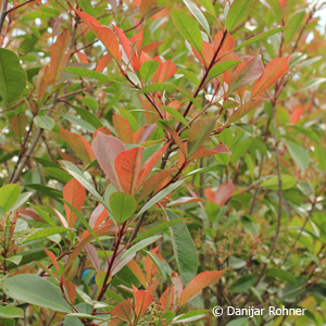 Immergrüner Strauch, bis ca. 2,5 m hoch werdend. Blatt dunkelgrün, im Winter dunkelbraunrot. Junges Blatt im Austrieb leuchtend braunrot. Weisse Blüten in Dolden. Mai-Juni. Geschützter Standort. Sonne-Halbschatten. Schnittverträglich.