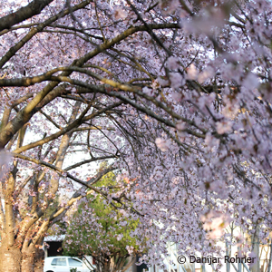 Stämmiger Baum mit einer breit ausladenden Krone. Höhe ca. 7-8 m. Grünes Blatt. Junges Laub bronzefarbig. Herbstfärbung gelb bis orange. Reinrosa, gefüllte Blüten in hängenden Trauben. April-Mai. Sonniger Standort. Fruchtbare Böden.