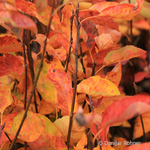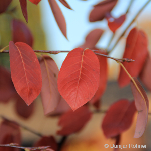 sommergrüner, breit auswachsender Strauch. Wächst zu mehrstämmigem Baum aus. Höhe 4-7 m. Blatt im Austrieb bronzefarbig. Im Sommer grün, Herbstfärbung rot und orange. Weiße Blüten in lockeren Trauben. Frühes Frühjahr.