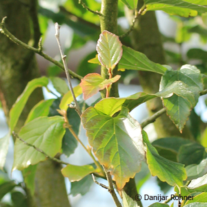 sommergrüner Grossstrauch oder kleiner Baum. Grillige, ausladende Zweige. Höhe 4-7 m. Grünes Blatt mit einem purpurfarbigen Rand. Herbstfärbung glühend rot-gelb. Alte Pflanze blühen rot im Winter. Humusreiche Böden.