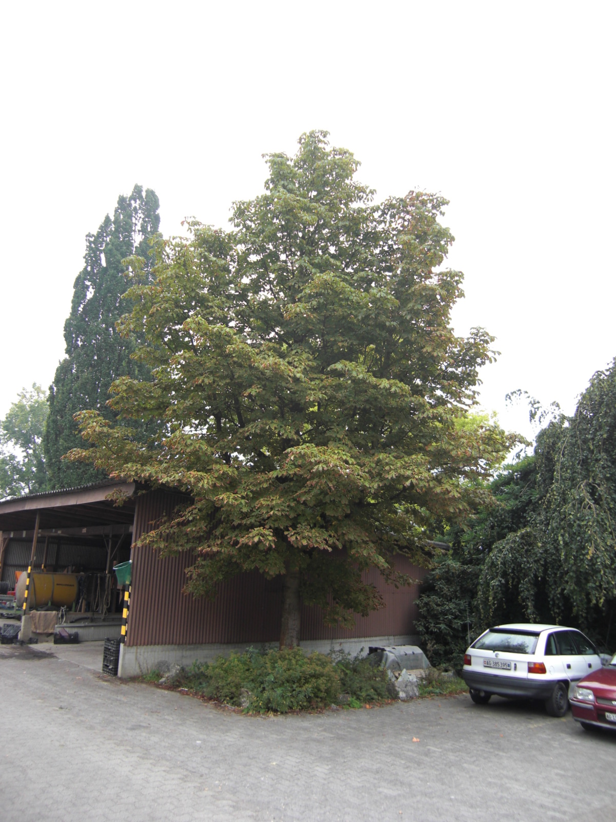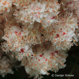 Beliebter Schatten-, Allee- und Parkbaum, teilweise auch verwildert. Hippocastanum kommt von Hippos (Pferd) und Kastanon (Kastanie) und soll andeuten, dass im Gegensatz zur Esskastanie die Früchte der Rosskastanie nicht zum menschlichen Verzehr geeignet sind. Ca. im 18. Jahrhundert bei uns eingeführt. Höhe: 15 – 28m, Breite: 13 – 25m. Cremegelb blühend im Mai. Nicht fruchtend.