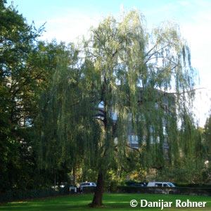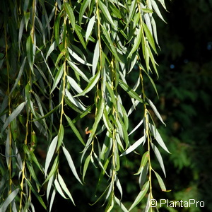 Grosser, bis 20 m hoch werdender Baum, breitkronig, mit langen, senkrecht hängenden, hellgelben Trieben und Zweigen. Blüte: Im April, 4-6 cm lange, gelblichgrüne Kätzchen, kurz vor dem Laubaustrieb. Blatt: Schmal-lanzettlich, 4-6 cm lang, Oberseite graugrün, Unterseite heller. Verwendung: Einzelstand, Parkbaum, für Gärten und besonders schön am Ufer von Bächen und Seen.
