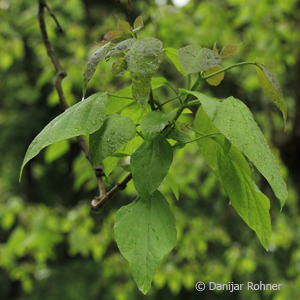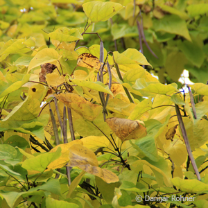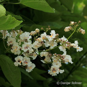 Breit auswachsender, sommergrüner Baum. Höhe 10-15 m. Grosse hellgrüne Blätter. Weisse Blüten mit einem gelben Herz in aufrechten Rispen. Juni-Juli. Lange, dünne Hülsenfrüchte im Herbst und Winter. Gut schnittverträglich.