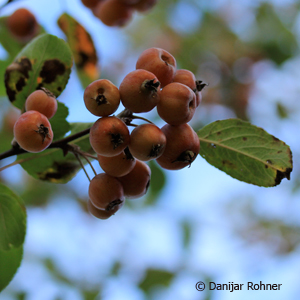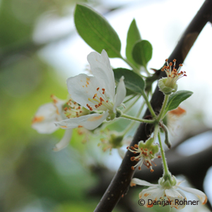 Sommergrüner, wüchsiger Strauch bis kleiner Bauch, ca. 4 bis 6 m hoch. Hellrosa Knospen und silbrig-weisse Blüte. Reichblühend im April und Mai. Sonnig. Im Spätsommer zahlreiche, langhaftende orange Zieräpfel.